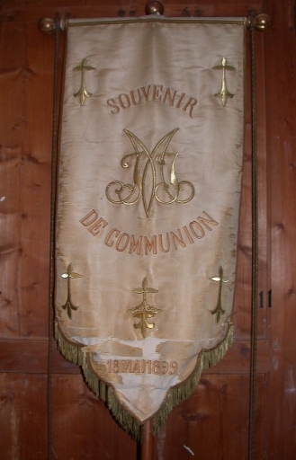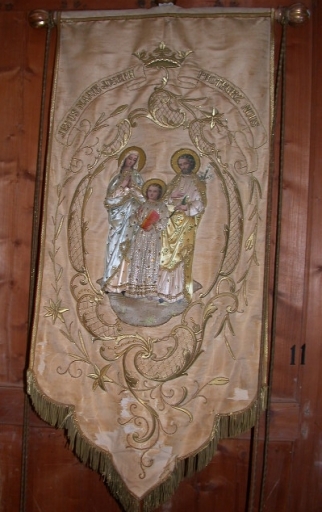 Bannière de procession n°7 : Jésus Marie Joseph : soie (blanche) : faille française, moirée, application, adjonction ; carton (support) : peint, polychrome ; fil métal : doré, argenté ; 94 h. Inscription : JESUS MARIE JOSEPH PROTEGEZ NOUS. SOUVENIR DE COMMUNION/18 MAI 1899. Oeuvre déposée. Limite 19e siècle 20e siècle. Fig. 34, 35.