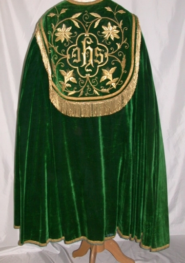 Chape verte : soie (verte) : velours uni, application sur textile, fil métal : doré. oeuvre déposée. Limite 19e siècle 20e siècle. Représentation : ornementation stylisée ; I.H.S. Fig. 54.