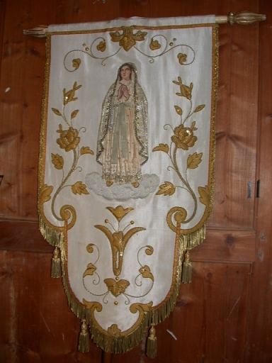 Bannière de procession n°5 : Immaculée ; MA : soie (blanche) : faille française, moirée, application, adjonction ; carton (support) : peint, polychrome ; fil métal : doré, argenté ; 94 h. oeuvre déposée. Limite 19e siècle 2àe siècle. Fig. 30, 31.