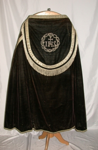 Chape noire 3 : soie (noire) : velours uni, application sur textile ; fil métal : doré. oeuvre déposée ; le tissu est sale. 4e quart 19e siècle. Représentation : ornementation végétale ; croix. Fig. 48.
