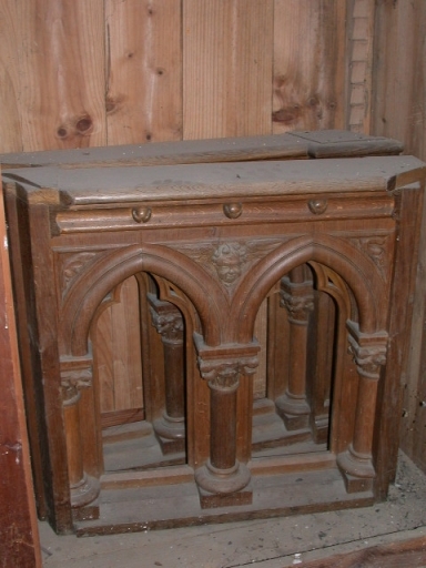 Clôture de choeur : chêne : tourné, mouluré, découpé, décor dans la masse, décor en bas relief ; 75 h. oeuvre déposée. 2e moitié 19e siècle. Fig. 72.