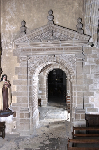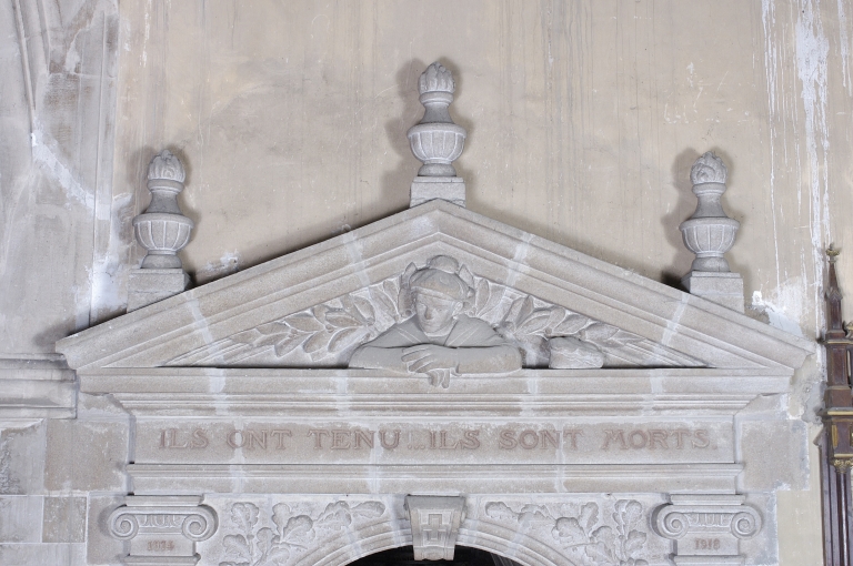 Les noms sont gravés sur 2 colonnes avec initiales du prénoms et noms de famille sans ordre apparent.PRIEZ POUR EUX sur les 4 piles de l'arc. Au fronton : ILS ONT TENU/ILS SONT MORTS A NOS SOLDATS MORTS POUR LA France.