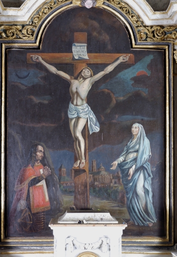 Tableau d'autel : Christ en croix, avec la Vierge et un donateur,