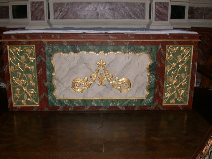 - bois, mouluré, peint, polychrome, peint à la poudre d'or, faux marbre, décor rapporté, décor en bas relief