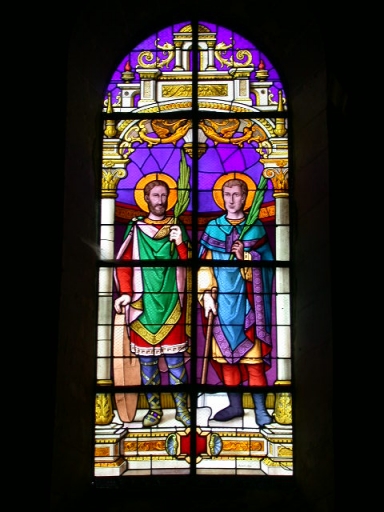 Ensemble de 3 verrières à personnages des baies 8, 10, 00 : Apparition du Sacré Coeur à sainte Marguerite-Marie, Apparition de Notre-Dame de Lourdes à sainte Bernadette (?), Saint Crépin et Saint Crépinien,