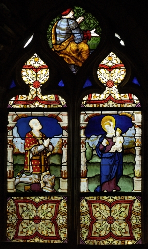 Le chevalier, dans la verrière de la baie 2, porte sur lui ses armoiries : de gueules billeté d'or.