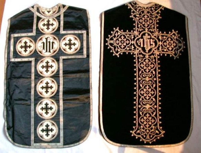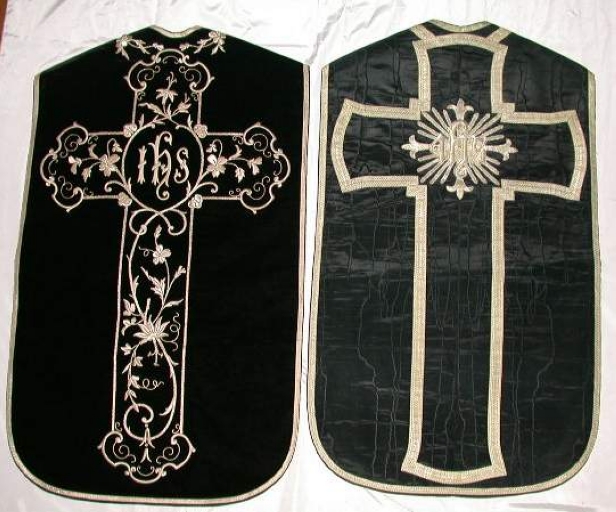 Ornement noir 7 : Chasuble, étole : soie (noire) : velours uni, application sur textile ; fil métal ; argenté. Oeuvre déposée ; il manque la bourse de corporal, le manipule et le voile de calice. 4e quart 19e siècle. Représentation : IHS ; ornementation végétale. Fig. 28.