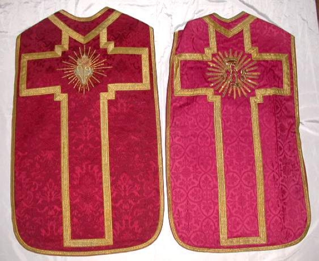 Ornement rouge 3 : Chasuble, étole : soie (rouge) : tissu façonné, application sur textile, adjonction d´éléments ; fil métal : argenté, doré. Oeuvre déposée ; il manque la bourse de corporal, le manipule et le voile de calice. Limite 19e siècle 20e siècle. Représentation : coeur enflammé. Fig. 31.