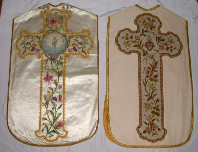Ornement blanc 3 : Chasuble, 2 dalmatiques, voile huméral, 2 étoles, 2 manipules, voile de calice : soie (blanche) : satin, application sur textile, brodé, polychrome ; fil métal : doré. Oeuvre déposée ; il manque la bourse de corporal. Limite 19e siècle 20e siècle. Représentation : IHS ; Vierge ; ornementation végétale. Fig. 21, 22.