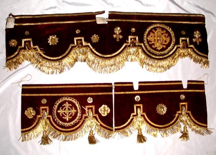 Garniture de brancard de procession 1 : soie (rouge) : velours uni, application sur textile, adjonction d'éléments ; fil métal : doré. Oeuvre déposée. Limite 19e siècle 20e siècle. Représentation : IHS ; ornementation végétale ; étoile. Fig. 19.