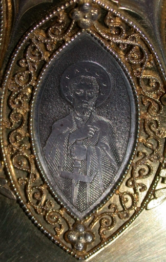 Les poinçons sont sur la coupe. Sous le pied, inscription gravée : I R / 9-10 JUIN / 1906. Sous le pied, sur une plaque, marque en creux : Mon ROUXEL-LE-DAIN / BETIN FRES SUCrs / RENNES. Dans la boîte, marque imprimée en doré sur une étiquette : ORNEMENTS d'EGLISE / BRONZES / ORFEVRERIE / 3 RUE MOTTE-FABLET RENNES / Mon ROUXEL-LEDAIN / BETIN Frères Succrs / DIPLÔME D´HONNEUR / RENNES 1887 / FABRIQUE DE / BRODERIE. Sur le couvercle, lettres gravées I R.