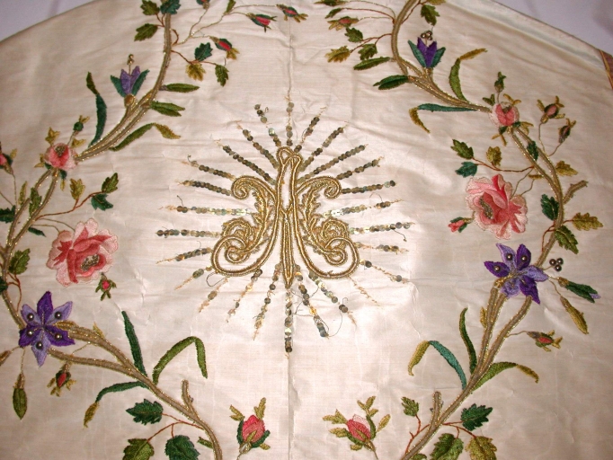 - soie, blanche faille française, moiré, brodé, polychrome, application sur textile, adjonction d'éléments