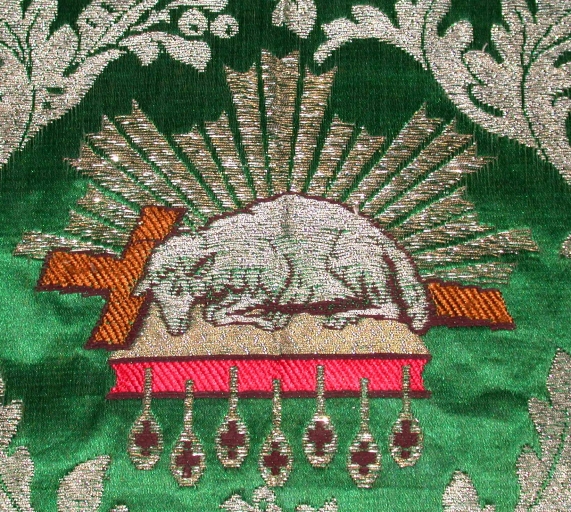 Le tissu façonné du devant de la chasuble est coupé par l'usure. Il manque la bourse de corporal, l'étole, le manipule et le voile de calice.