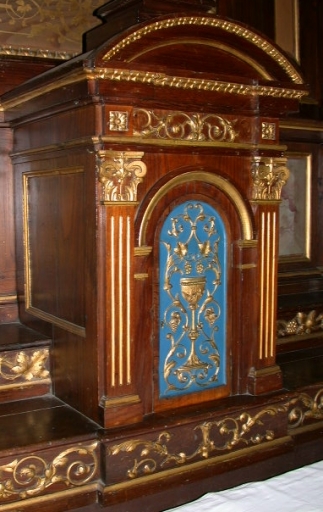 - bois, mouluré, décor dans la masse, décor en demi relief, peint à la poudre d'or, faux marbre, peint au pochoir, peint, polychrome