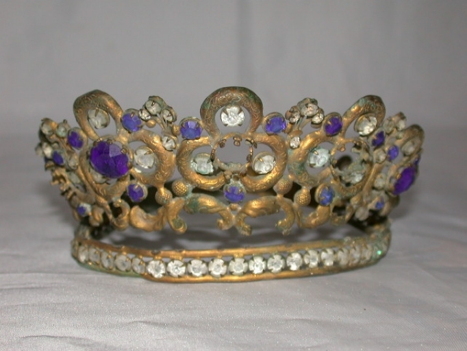 Couronne de statue : métal : fondu, doré ; verre transparent (coloré) : taillé à facettes ; 11, 5 d. Oeuvre déposée ; il manque deux grosses pierres. Limite 19e siècle 20e siècle. Fig. 12.