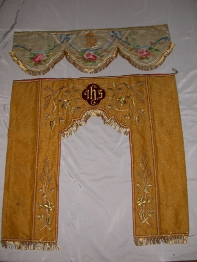 Conopée 2 : soie (jaune) : drap d'or, application sur textile, adjonction d'éléments. Oeuvre déposée. Limite 19e siècle 20e siècle. Représentation : croix ; I.H.S ; ornementation stylisée. Fig. 19.