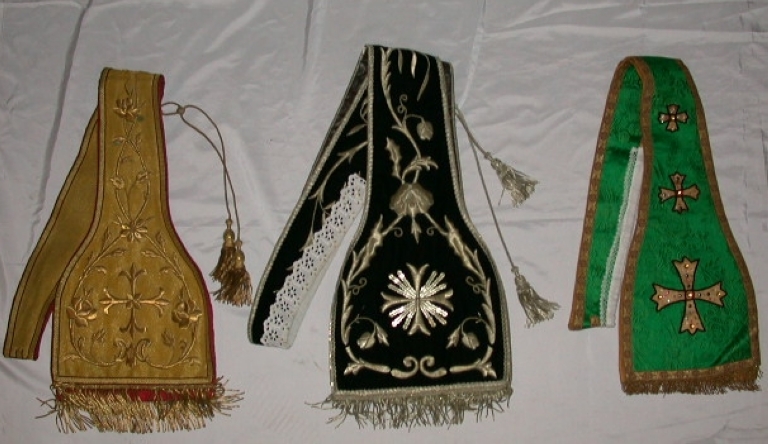 Étole pastorale réversible : soie (blanche, violette) : satin, brodé, polychrome, application sur textile. Oeuvre déposée ; extrêmement reprisée. Limite 19e siècle 20e siècle. Représentation : croix. Fig. 36.