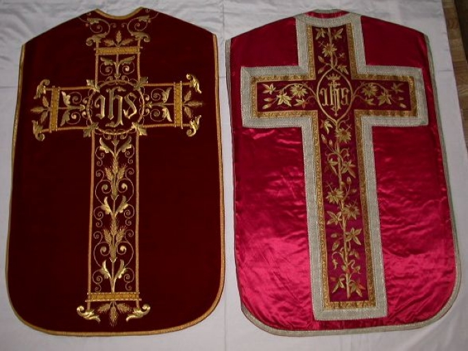 Ornement rouge 2 : Chasuble, bourse de corporal, étole, manipule, voile de calice : soie (rouge) : satin, application sur textile ; Oeuvre déposée. Limite 19e siècle 20e siècle. Représentation : I.H.S. ; couronne ; ornementation végétale. Fig. 34.