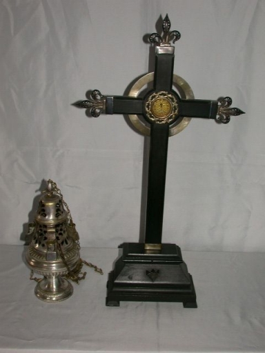 Croix-Reliquaire : bois, mouluré, peint ; argent ; fondu, métal : argenté ; 53,5 h. Oeuvre déposée ; oeuvre remaniée au milieu 20e siècle. 2e moitié 19e siècle. Fig. 14.