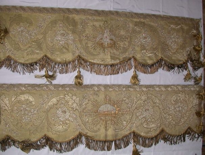 Garniture de dais : soie (jaune) : tissu façonné, application sur textile ; fil métal : doré, argenté. Oeuvre déposée ; le tissu d´un des pans est coupé. 2e moitié 19e siècle. Représentation : agneau aux sept sceaux ; pélican mystique ; triangle ; arche d´alliance. Fig. 17, 18, 19, 20, 21, 22.