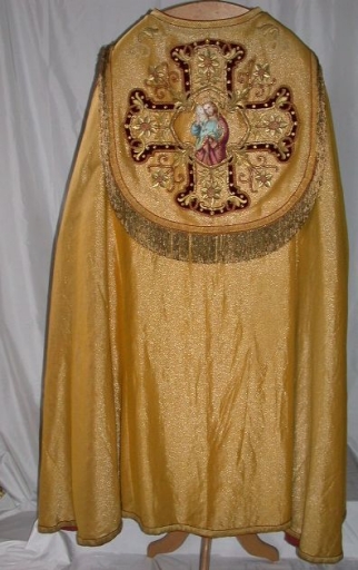 Chape dorée : soie (jaune) : drap d´or, application sur textile, adjonction d´éléments ; fil métal : doré. Oeuvre déposée. 4e quart 19e siècle. Représentation : ornementation végétale ; le Bon Pasteur ; croix. Fig. 29.