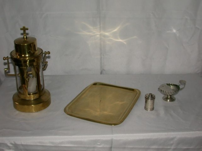 Ampoule à huiles saintes : métal : fondu, argenté, gravé ; bois : mouluré, vernis ; h. Oeuvre déposée. Inscription gravée sur la boîte : O.S. / S.C. / O.I. Fig. 13.