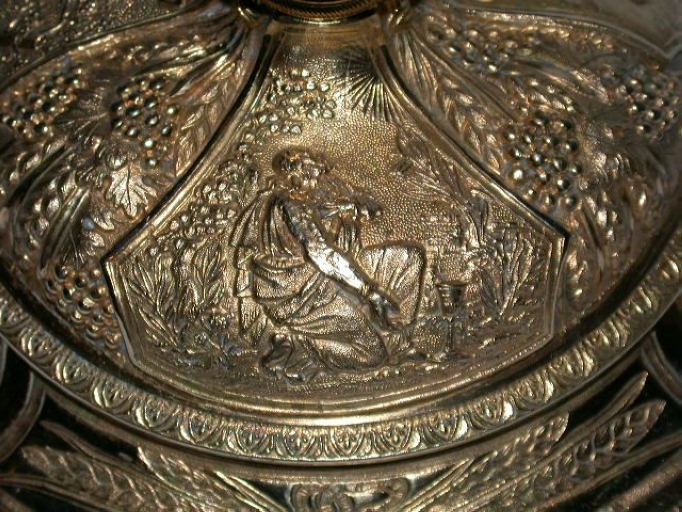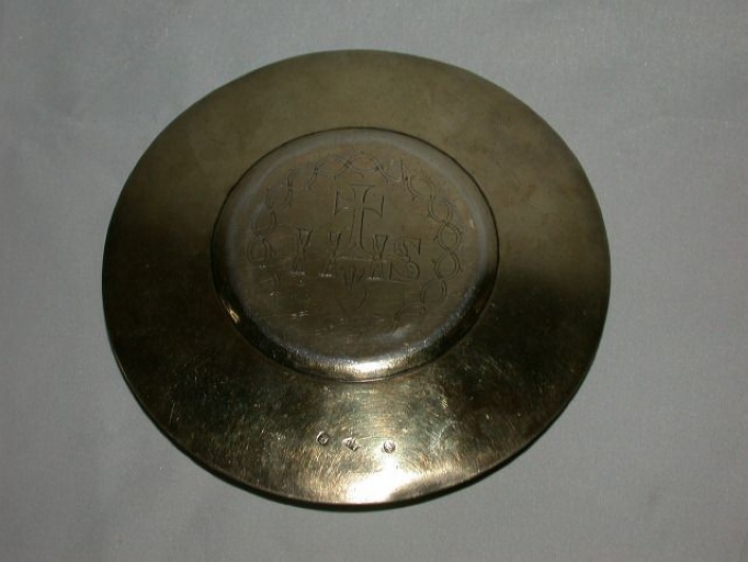 Calice et patène fabriqués par Alexis Renaud dont le poinçon a été créé en 1831 et biffé en 1847. Cet ensemble a appartenu à Germain Moizan, prêtre entre 1886 et 1920.