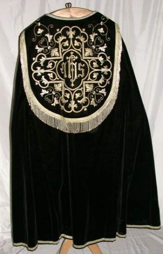 Chape 5 : soie (noire) : velours uni, application sur textile ; fil métal : argenté. Oeuvre déposée. Limite 19e siècle 20e siècle. Représentation : I.H.S. ; croix ; représentation végétale. Fig. 22.