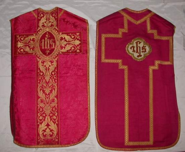 Ornement rouge 5 : Chasuble, bourse de corporal, manipule, voile de calice : soie (rouge) : gros de Tours, tapisserie au point, polychrome, application sur textile. Oeuvre déposée ; il manque l´étole. Limite 19e siècle 20e siècle. Représentation : I.H.S. ; quadrilobe. Fig. 35.