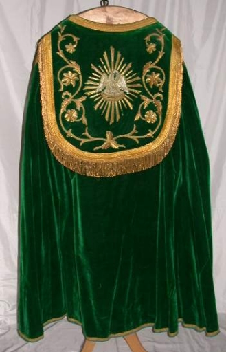 Chape 7 : soie (verte) : velours uni, application sur textile, adjonction d´éléments ; fil métal : doré. Oeuvre déposée. Limite 19e siècle 20e siècle. Représentation : I.H.S. ; rayon ; rinceau fleuri. Fig. 24.