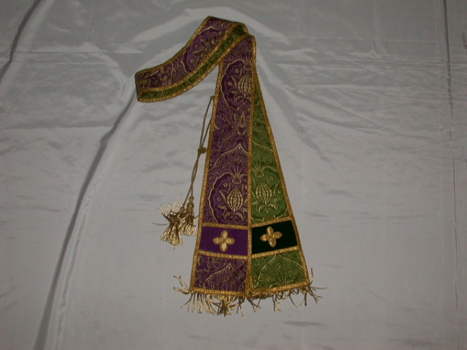 Étole pastorale réversible : soie (violette, verte) : tissu façonné, broché, application sur textile ; fil métal : doré. Oeuvre déposée. 1er quart 20e siècle. Représentation : croix ; ornementation. Fig. 40.