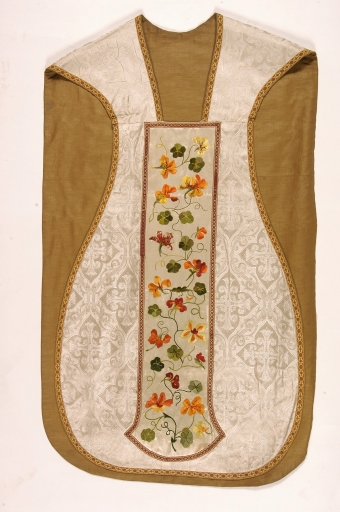 Chape 3 : soie (blanche) : tissu façonné, brodé, polychrome, application sur textile. Oeuvre déposée. Limite 19e siècle 20e siècle. Représentation : I.H.S. ; représentation végétale. Fig. 20.