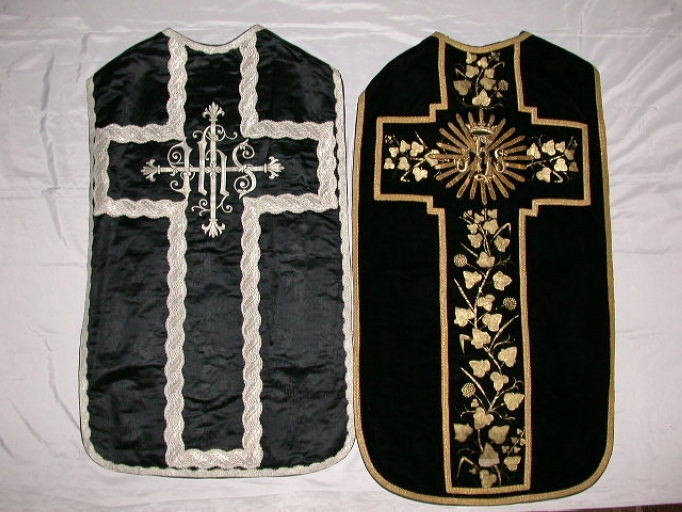 Ornement noir 4 : Chasuble, bourse de corporal, étole, manipule, voile de calice : soie (noire) : velours uni, peint doré, application sur textile, adjonction d´éléments ; fil métal : doré. Oeuvre déposée. 1er quart 19e siècle. Représentation : I.H.S. ; rayon ; rinceau de lierre. Fig. 34.