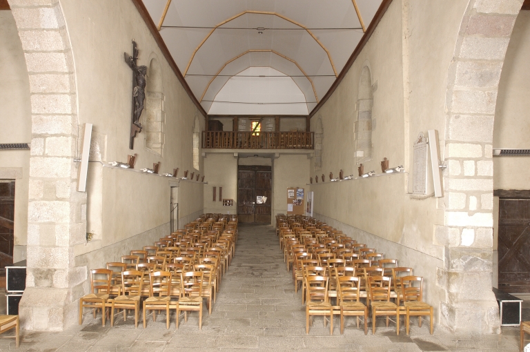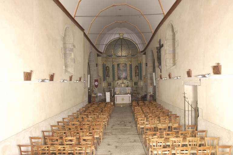 Ornement blanc 3 : Chasuble, bourse de corporal, étole, manipule, voile de calice : soie (blanche) : gros de Tours, application sur textile, tapisserie au point, polychrome. Oeuvre déposée ; le galon des accessoires a été remplacé. 1er quart 20e siècle. Représentation : I.H.S. ; représentation végétale. Fig. 27, 28.