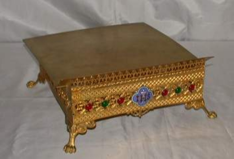 Pupitre d´autel-Thabor : métal : fondu, doré, émail, polychrome ; verre transparent (vert, rouge) : taillé en cabochon ; 30 la. Oeuvre déposée. 1er quart 20e siècle. Représentation : I.H.S. ; croix. Fig. 6.