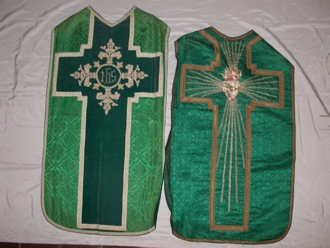 Ornement vert 2 : Chasuble, bourse de corporal, manipule, voile de calice : soie (verte) : tissu façonné, satin, peint, polychrome, application sur textile. Oeuvre déposée ; il manque l´étole. 1er quart 20e siècle. Représentation : coeur enflammé ; rayon. Fig. 36.