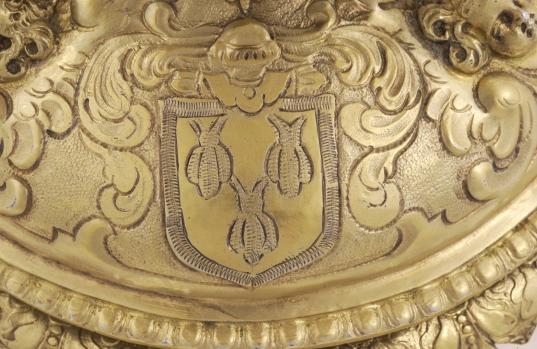 Les poinçons sont sous le pied ; poinçon d'orfèvre illisible ; poinçon de communauté : lettre R couronnée. Les armoiries de la famille Barrin, seigneur du Bois-Geffroy font partie du décor du pied.