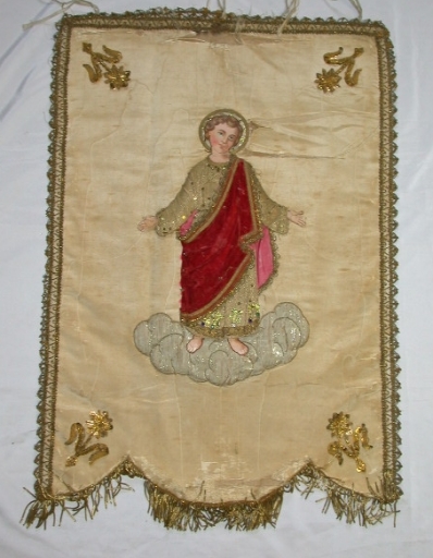 Bannière de procession : soie (blanche) : faille française, moirée, application sur textile, adjonction d´éléments ; fil métal : doré ; carton (support) : peint, polychrome. Oeuvre déposée. 2e moitié 19siècle. Représentation : Immaculée Conception ; Enfant Jésus. Fig. 16, 17.
