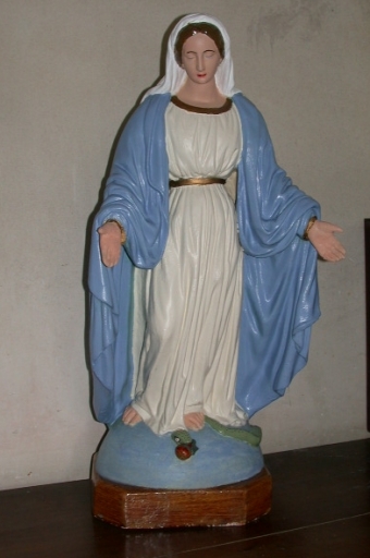Statue Immaculée Conception : plâtre : moulé, peint, polychrome ; 91 h. Oeuvre déposée et repeinte ; les mains ont été recollées. 4e quart 19e siècle. Fig. 50.