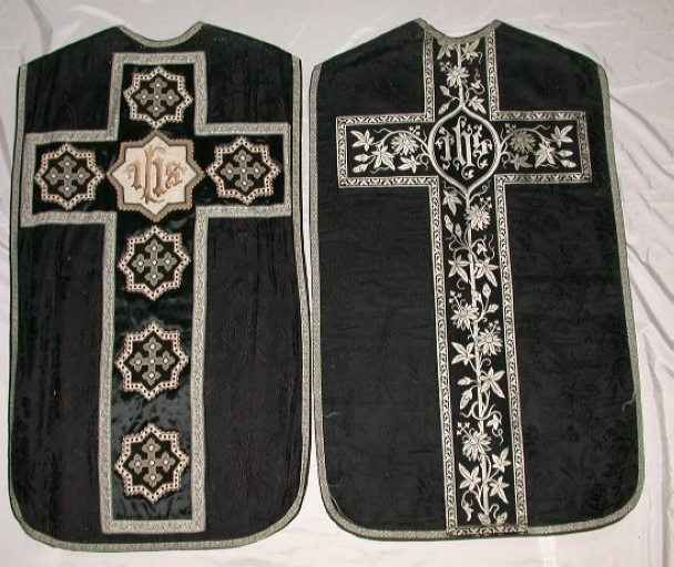 Ornement noir 1 : Chasuble, bourse de corporal, étole, manipule, voile de calice : soie (noire) : tissu façonné, application sur textile, tapisserie au point. Oeuvre déposée. 4e quart 19e siècle. Représentation : croix ; I.H.S.. Fig. 42.