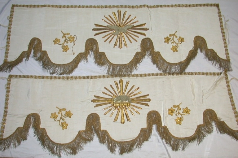 Garniture de Dais de procession : soie (blanche) : gros de Tours, application sur textile, adjonction d´éléments. Oeuvre déposée. Limite 19e siècle 20e siècle. Représentation : colombe du Saint Esprit ; Arche d´Alliance ; agneau aux sept sceaux ; pélican mystique ; ornementation végétale. Fig. 24, 25, 26, 27, 28, 29.