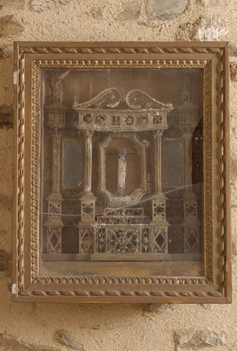 Reliquaires en forme d'autel et retable avec fronton, colonnes, pots à feu.