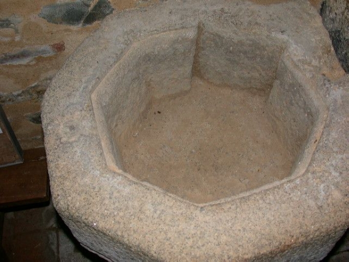 Anciens fonts baptismaux arrachés à un mur ou désolidarisés d'une partie double.