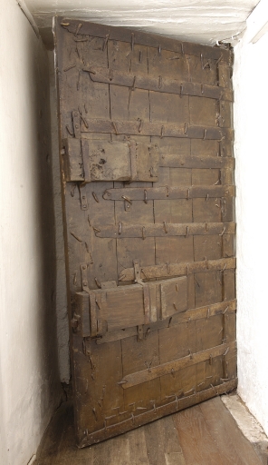 Porte de sacristie provenant de l'ancienne sacrisitie du 17e siècle -qui se trouvait à l'emplacement actuel de la chapelle nord- ou fabriquée à la fin du 18e siècle lors de la création de la sacristie au chevet de l'église : on retrouve dans la porte les clous qui sont sur les murs de la sacristie.