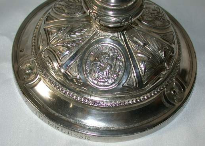 Les poinçons sont sur la coupe, les poinçons officiels sont sur le pied ; le poinçon de fabricant est sur la coupe et la fausse coupe. Inscription gravée sur la bate : PAROISSE DE MELESSE.