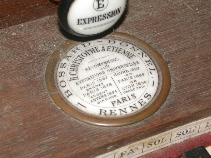 L'harmonium est l'oeuvre des facteurs parisiens Christophe & Etienne, après 1894, comme l'indique la réception d'une médaille de concours. Il a été acheté chez le marchand rennais Bossard-Bonnel.