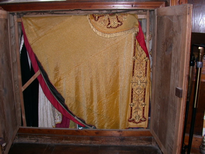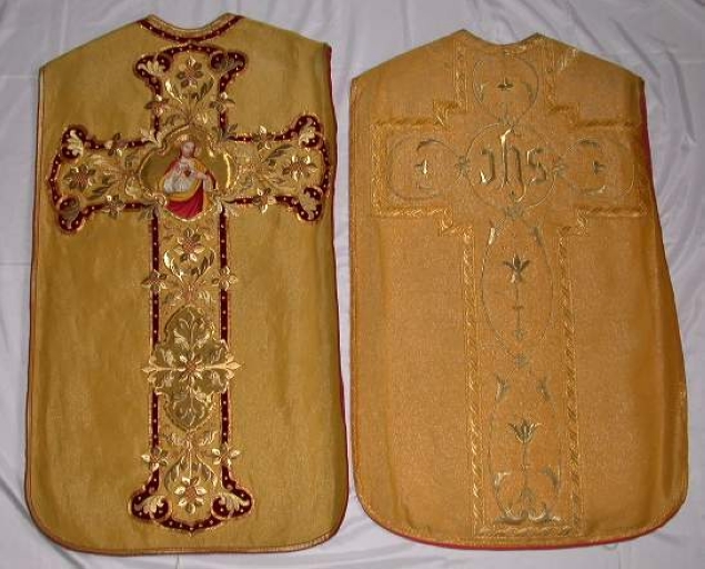 Ornement doré 1 : Chasuble, bourse de corporal, étole, manipule, : soie (jaune) : drap d´or, application sur textile ; fil métal : doré. Oeuvre déposée ; il manque le voile de calice. 1er quart 20e siècle. Représentation : Sacré Coeur ; croix ; rinceau fleuri. Fig. 47.