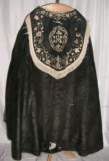 Chape 6 : soie (noire) : faille française, moirée, brodée, application sur textile. Oeuvre déposée. Limite 19e siècle 20e siècle. Représentation : I.H.S. ; couronne d´épines ; vigne. Fig. 37.