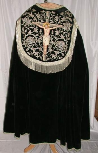 Chape 8 : soie (noire) : velours uni, brodé, polychrome, application sur textile ; soie (blanche) : satin, peint, polychrome, application sur textile ; fil métal : argenté, doré. Oeuvre déposée. Limite 19e siècle 20e siècle. Représentation : Christ en croix ; rinceau fleuri. Fig. 39.