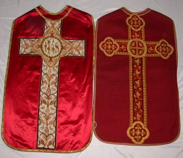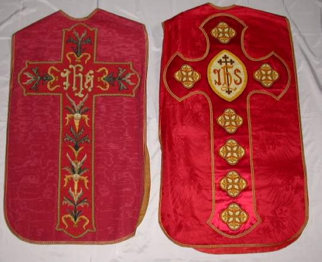 Ornement rouge 3 : Chasuble, bourse de corporal, étole, manipule : soie (rouge) : satin, application sur textile, tapisserie au point, polychrome. Oeuvre déposée ; il manque le voile de calice. 1er quart 20e siècle. Représentation : I.H.S. ; rinceau fleuri. Fig. 51.